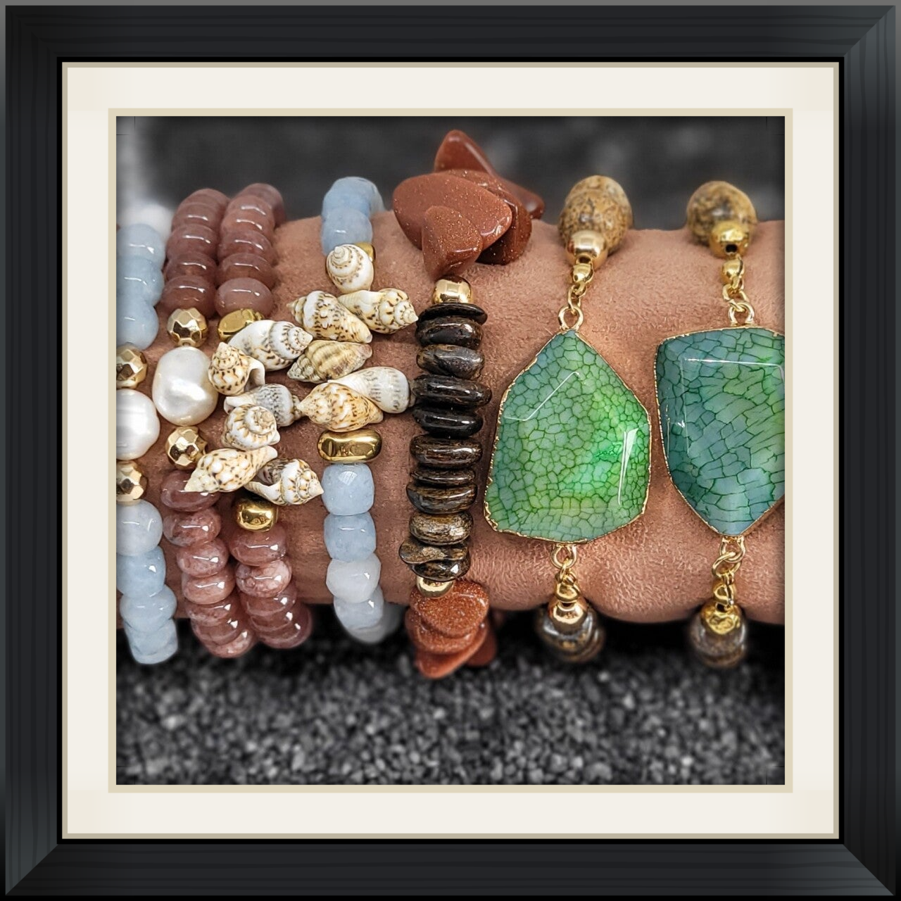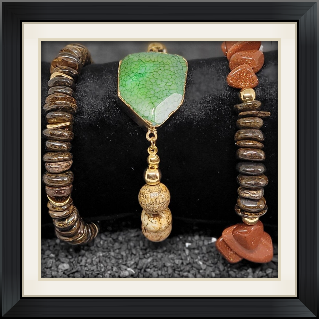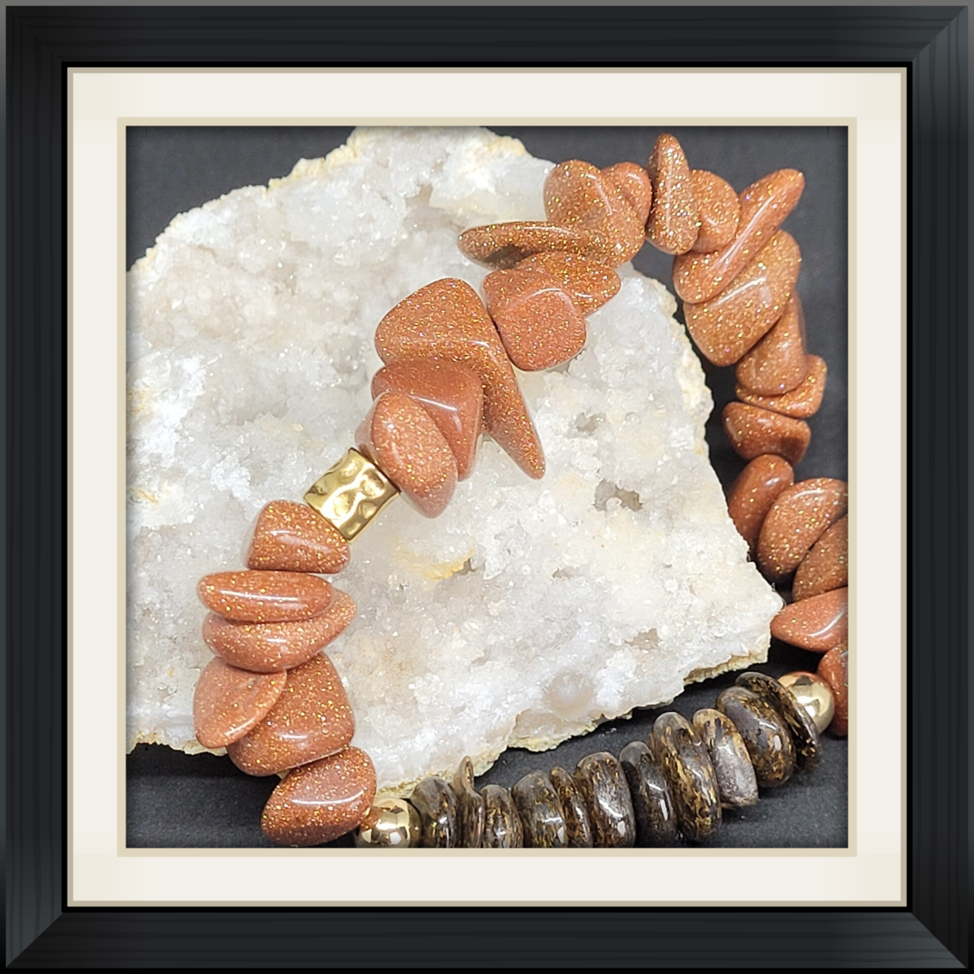 Deze prachtige armband is handgemaakt van grote 8 tm 12 mm goud zandsteen in combinatie met Bronziet en goudkleurig rvs.