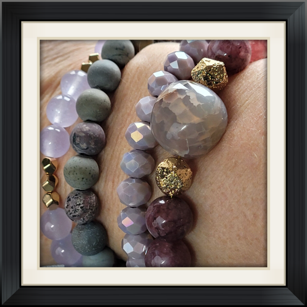 Deze 10 mm Lepidoliet armband heeft een Agaat kraal die echt prachtig is, om het geheel nog mooier te maken zijn er 2 Lavasteen kralen gebruikt die met goud verguld zijn. Er zit een verleng ketting aan zodat hij versteld kan worden.